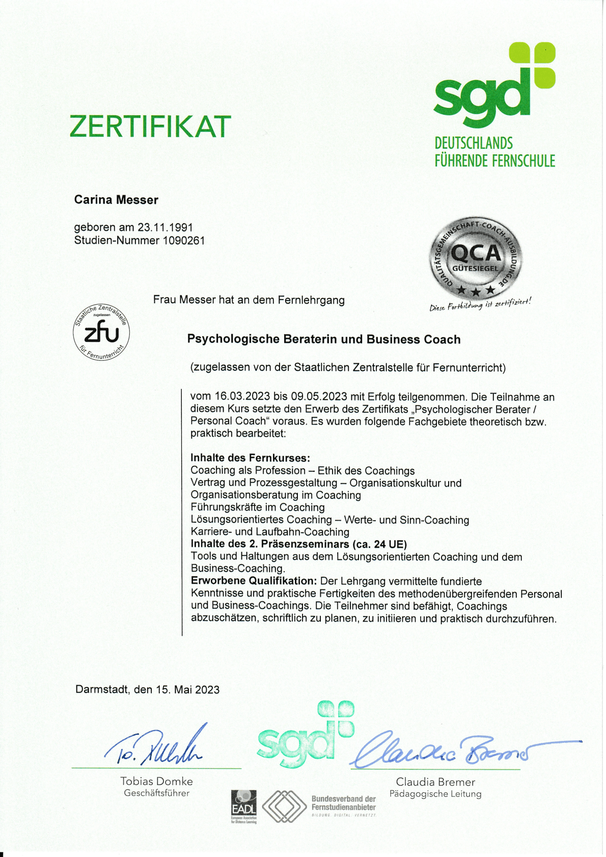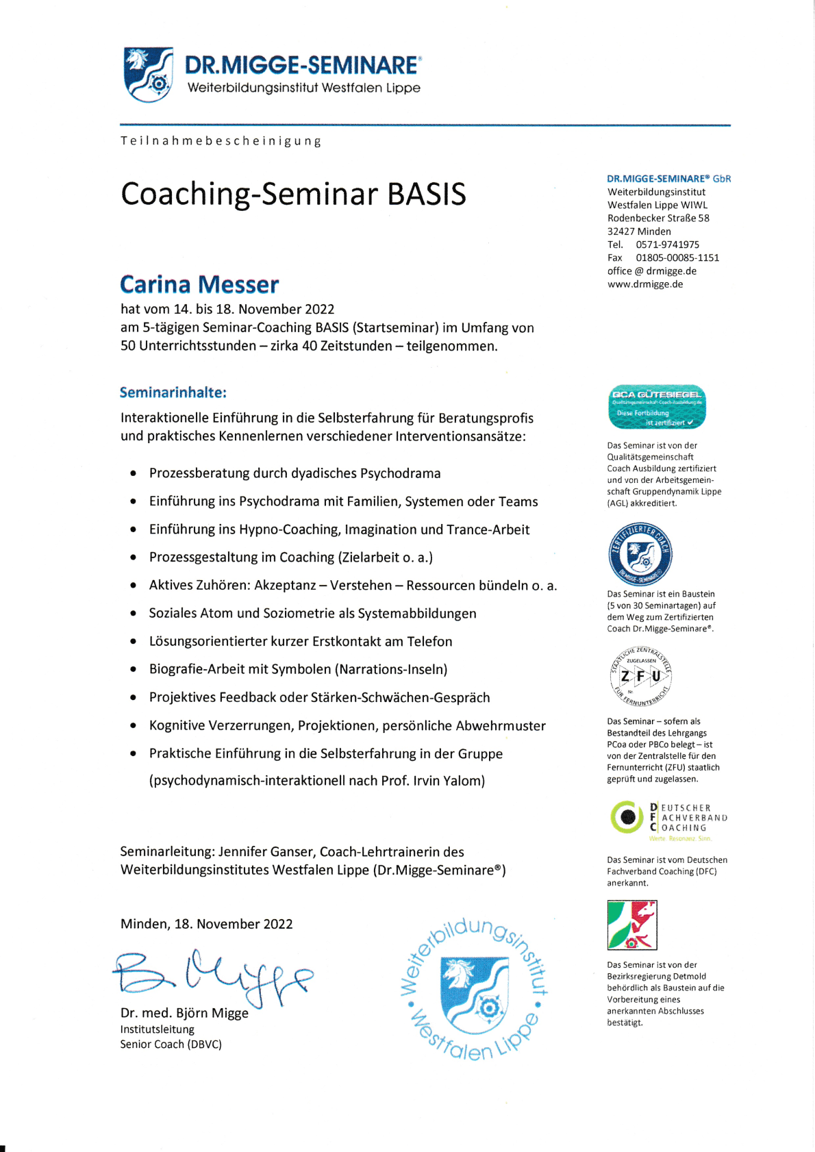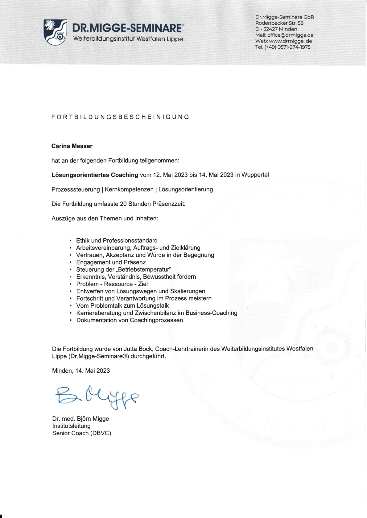Das Coaching mit Carina war klar strukturiert und von einer wertschätzenden und vertrauensvollen Atmosphäre geprägt. Die Inhalte und Methoden waren individuell auf mich abgestimmt, was das Coaching besonders effektiv gemacht hat. Alles in allem war das Coaching eine Bereicherung für mich – sowohl beruflich als auch persönlich.“