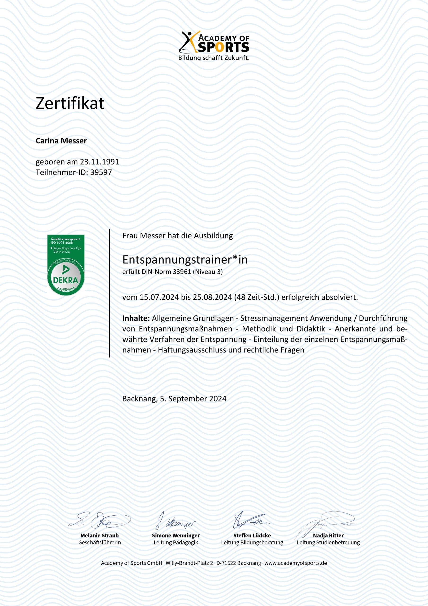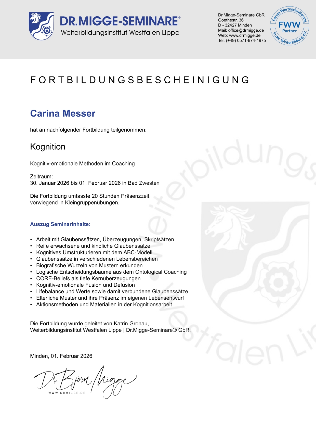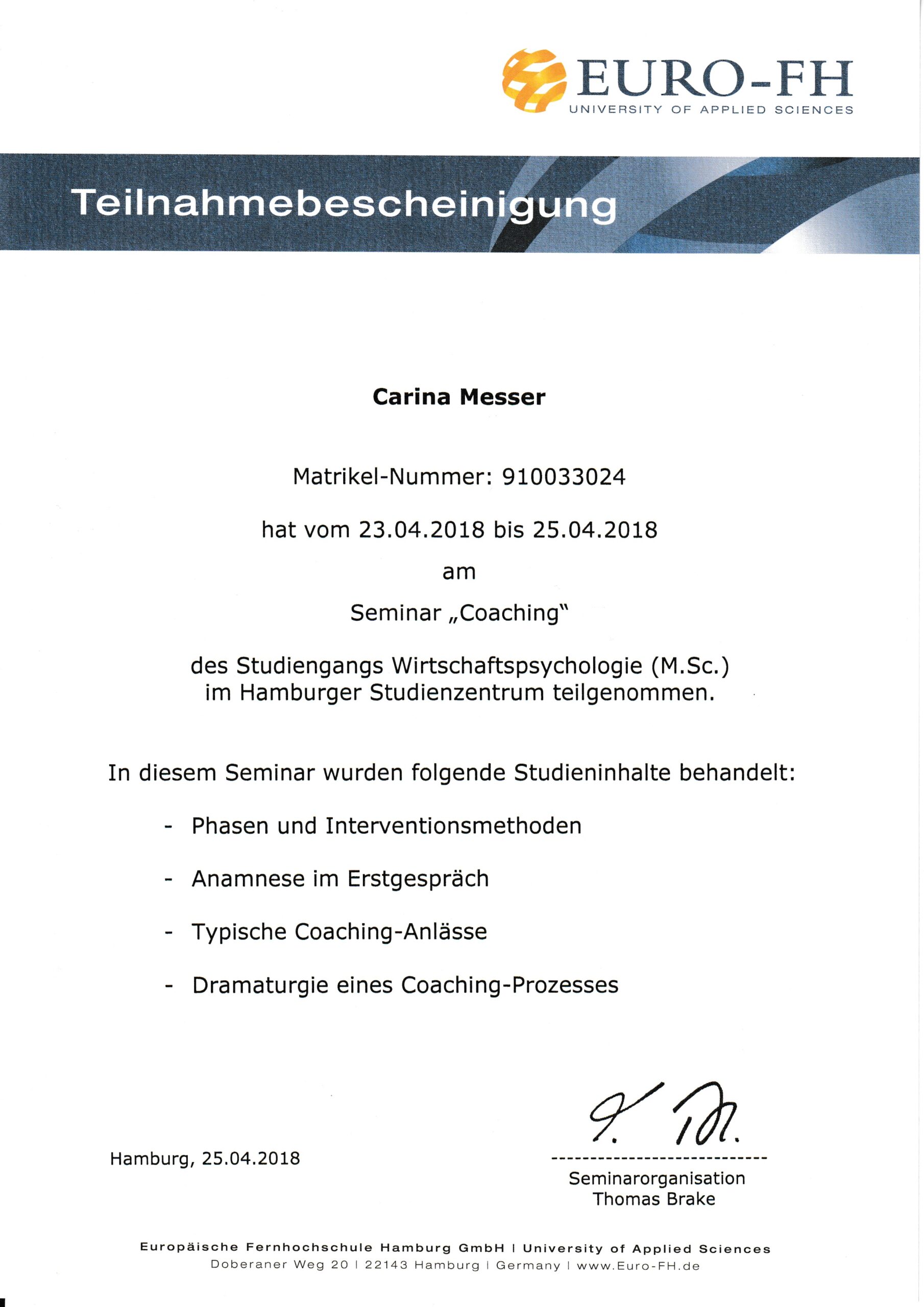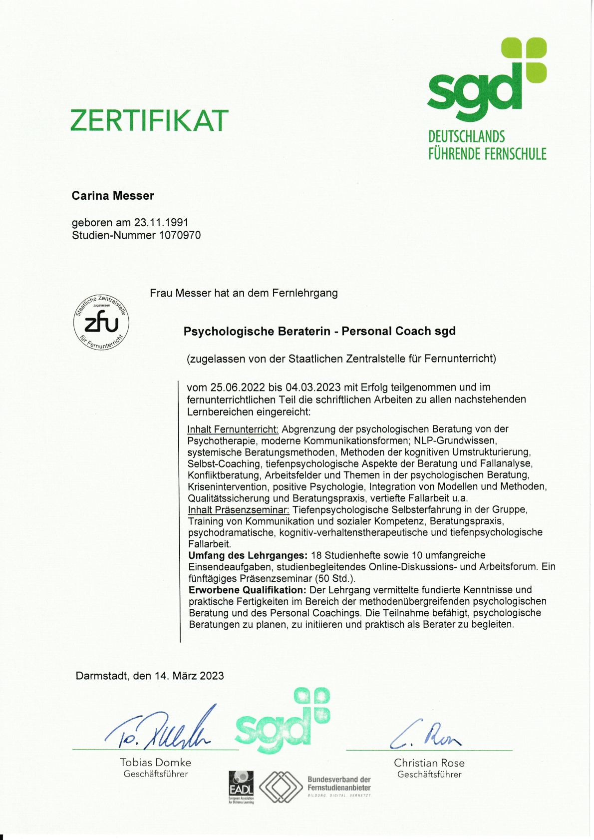 Das Coaching mit Carina war klar strukturiert und von einer wertschätzenden und vertrauensvollen Atmosphäre geprägt. Die Inhalte und Methoden waren individuell auf mich abgestimmt, was das Coaching besonders effektiv gemacht hat. Alles in allem war das Coaching eine Bereicherung für mich – sowohl beruflich als auch persönlich.“