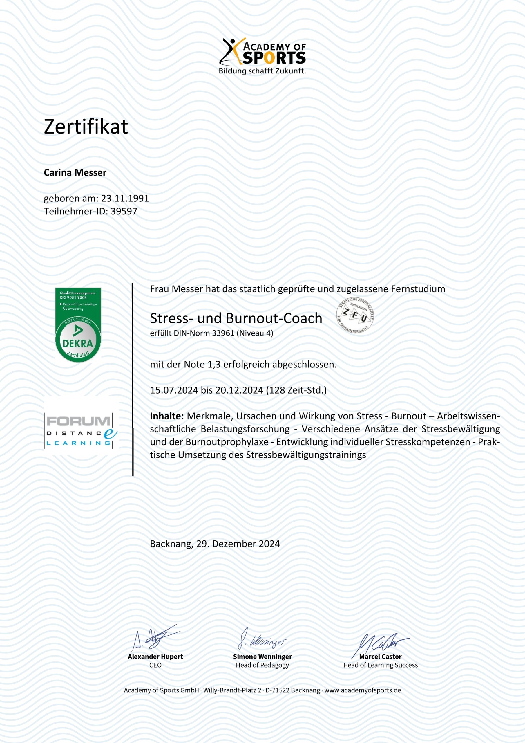 Durch meine Weiterbildungen zum Business & Mental Coach sowie Stress & Burnout Coach habe ich mich auf 1:1 Coachings zu den Themen Stressmanagement, Burnout-Prävention, mentale Gesundheit und Resilienz spezialisiert.